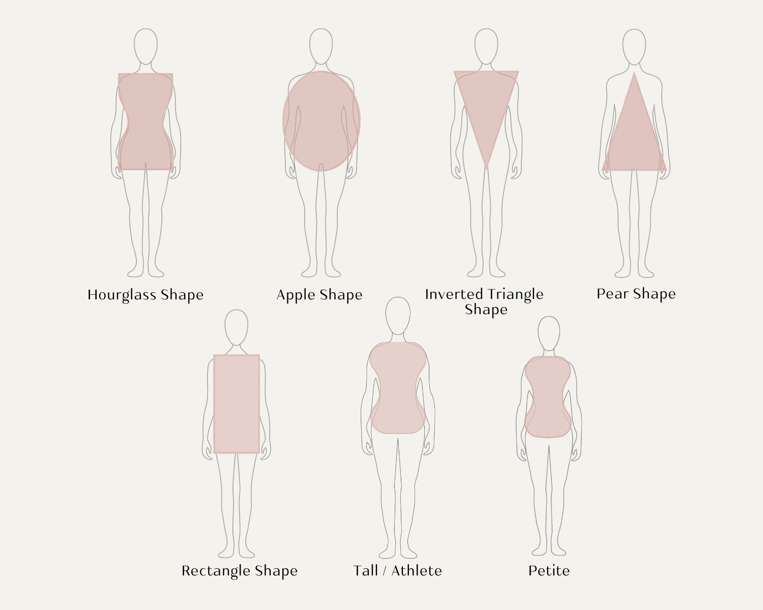 ก่อนที่เราจะเลือกชุดแต่งงานที่ใช่ เราต้องเข้าใจรูปร่างของเราเองก่อน ว่าเป็นรูปทรงแบบใด แล้วเราจะเลือกชุดแต่งงานแบบไหนถึงจะออกมาสวย โดยแบ่งคร่าว ๆ ได้ดังนี้ Hourglass – รูปทรงนาฬิกาทราย มีทั้งอกเอวสะโพกชัดเจน Apple – ทรงแอปเปิ้ล เอว สะโพกจะกว้างกว่าส่วนไหล่ Inverted Triangle – ช่วงไหล่กว้างกว่าช่วงสะโพก Pear – ทรงลูกแพร์ ช่วงไหล่และเอวจะเล็ก แต่สะโพกใหญ่ Rectangle – ทรงตรง อกเอวสะโพกเท่ากันหมด Tall / Athlete – หุ่นนักกีฬา Petite – สาวร่างเล็ก