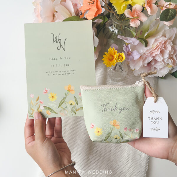 ของชำร่วย กระเป๋าซิปใส่เหรียญ พร้อมแท็กห้อยพิมพ์คำว่า thank you ขนาดเหมาะมือสามารถนำไปใช้ได้จริง